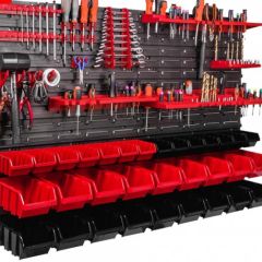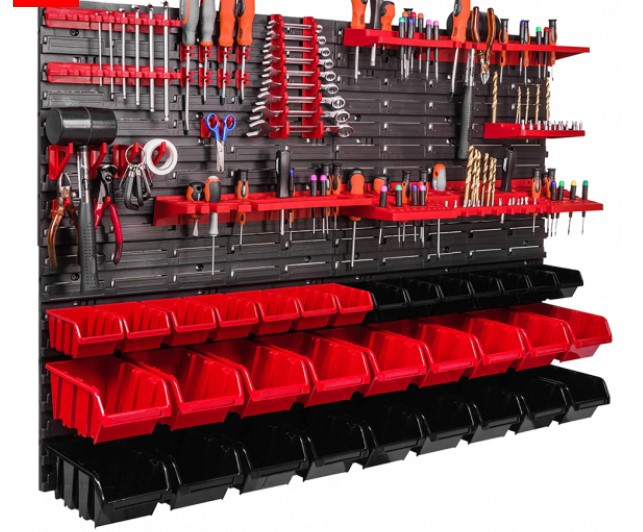 Панелі, гачки та контейнери витримують чималі навантаження й не згинаються. Прекрасно підійде як для професійної майстерні, так і для домашнього гаража.