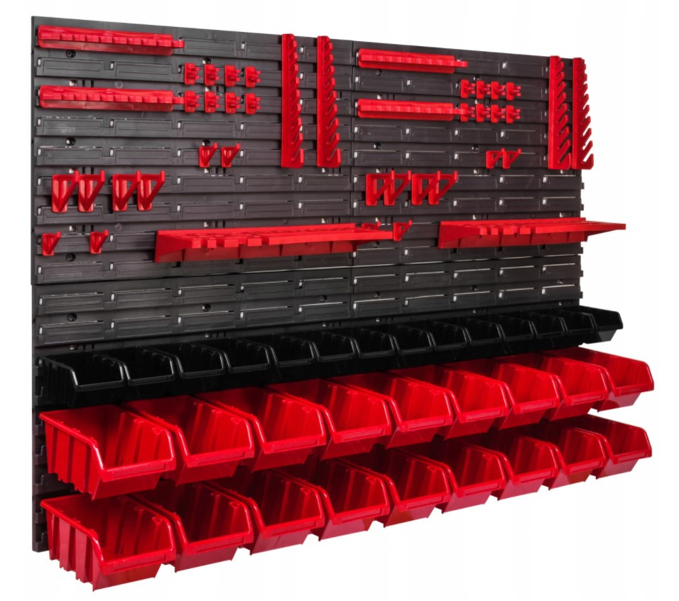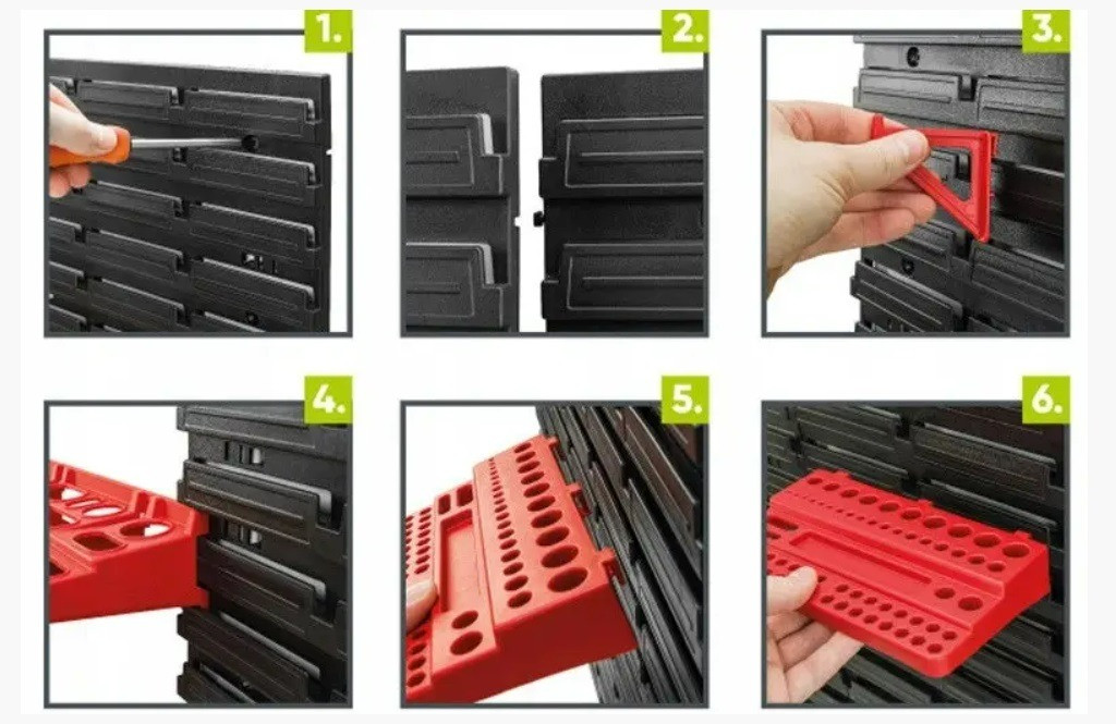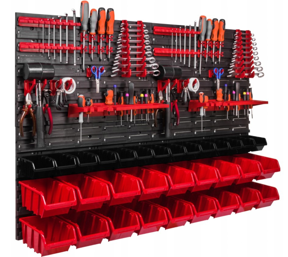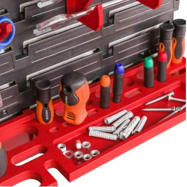 Незважаючи на те, що панелі, гачки та контейнери пластикові, вони витримують значні навантаження і не вигинаються. Добре підійде як для професійної майстерні, так і для домашнього гаража.