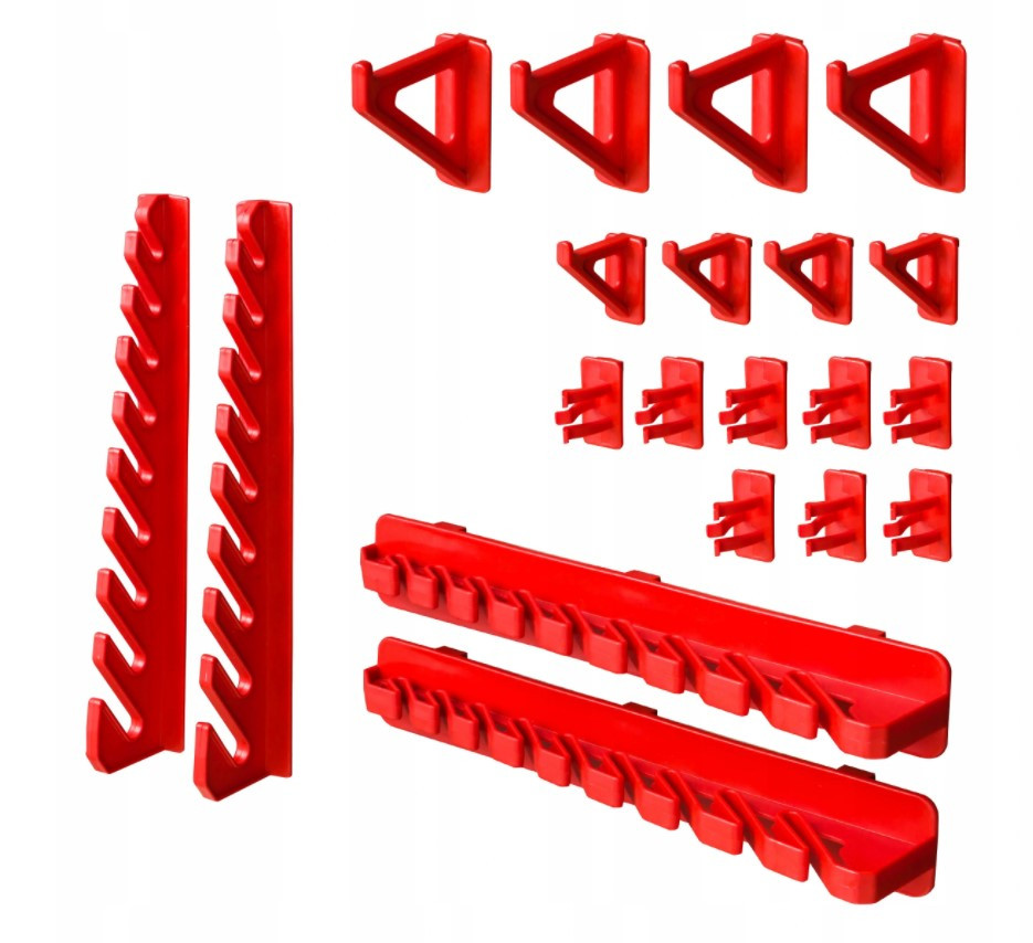 - тримач для інструментів (комплект) 1 шт. (КВН 20) (4 тримача для ріжкових ключів (2 вертикальних / 2 горизонтальних); 8 тримачів для відгорток, дрібних інструментів; 4 вішалки 5,5 см; 4 вішалки 3,5 см);