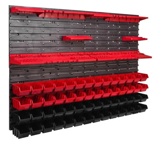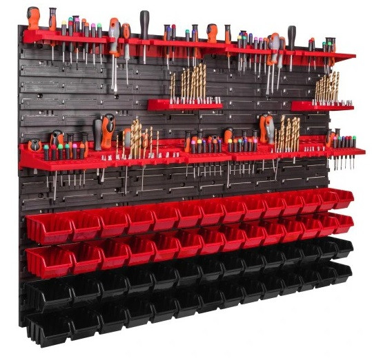 Панелі, гачки та контейнери витримують великі навантаження і не вигинаються. Добре підійде як для професійної майстерні, так і для домашнього гаража.