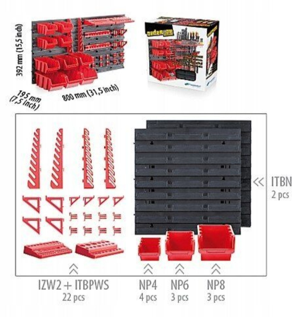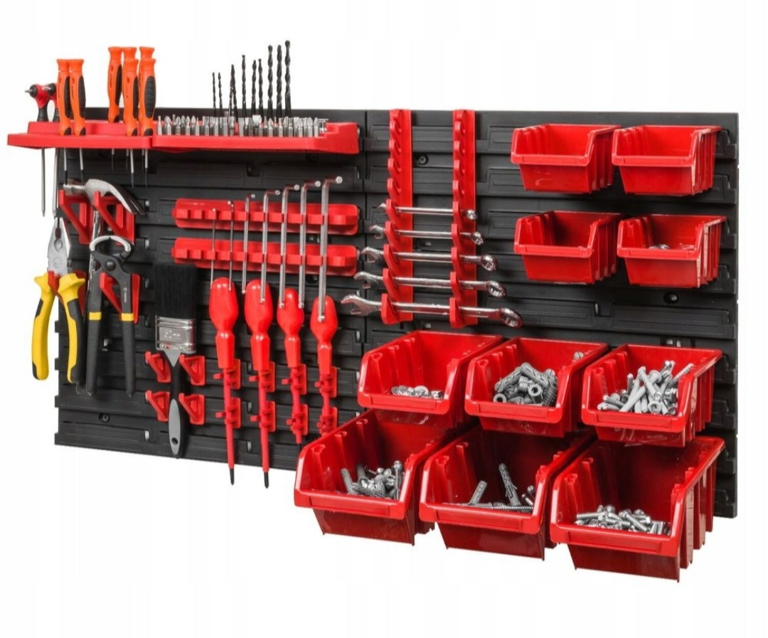 Контейнери можуть бути встановлені на дошці в будь-якому порядку. Дошки з'єднуються між собою горизонтально спеціальними замками на краях. Дошка ідеально підійде для гаража або майстерні.