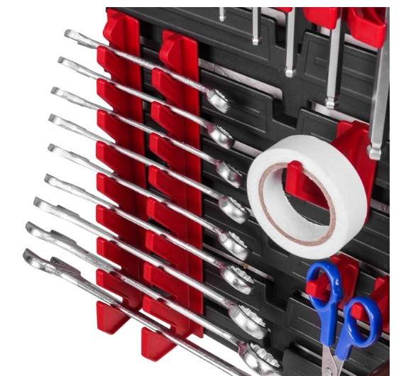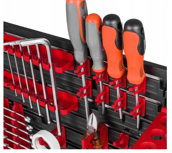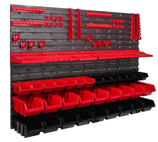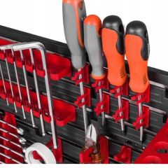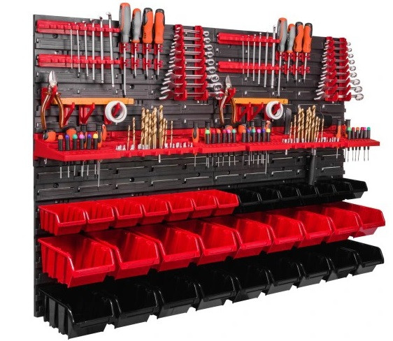 Ваші інструменти і витратний матеріал завжди під рукою, не розкинений і акуратно зібрані в одному місці. Розміщення елементів можна зробити за власним дизайном. Цю панель можливо модифікувати або зібрати згідно з вимогами ваших інструментів та інструментів (болів, гак, шурупів тощо). Панель складається з чотирьох пластмасових панелей Польского виробництва. Кожну частину можна прикріпити на 9 фіксаторів (саморізів, анкерів, дюбелів, болтів) до стінки, у свою чергу, це забезпечує стабільну фіксацію при дуже великих навантаженнях.