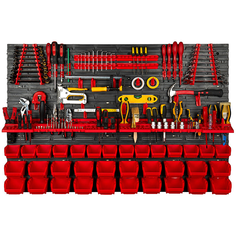 Ваші інструменти і витратний матеріал завжди під рукою, не розкинений і акуратно зібрані в одному місці. Розміщення елементів можна зробити за власним дизайном. Цю панель можливо модифікувати або зібрати згідно з вимогами ваших інструментів та інструментів (болів, гак, шурупів тощо). Панель складається з чотирьох пластмасових панелей Польского виробництва. Кожну частину можна прикріпити на 9 фіксаторів (саморізів, анкерів, дюбелів, болтів) до стінки, у свою чергу, це забезпечує стабільну фіксацію при дуже великих навантаженнях.
