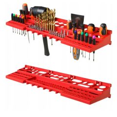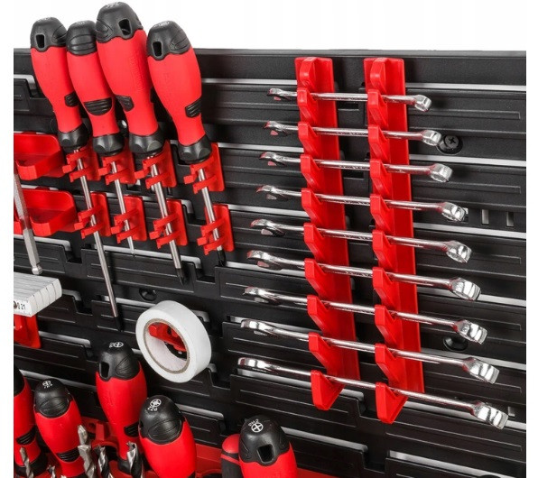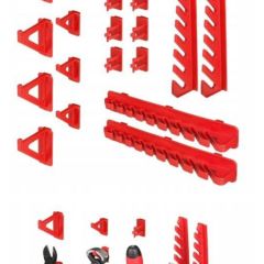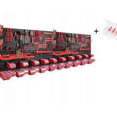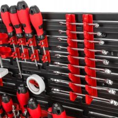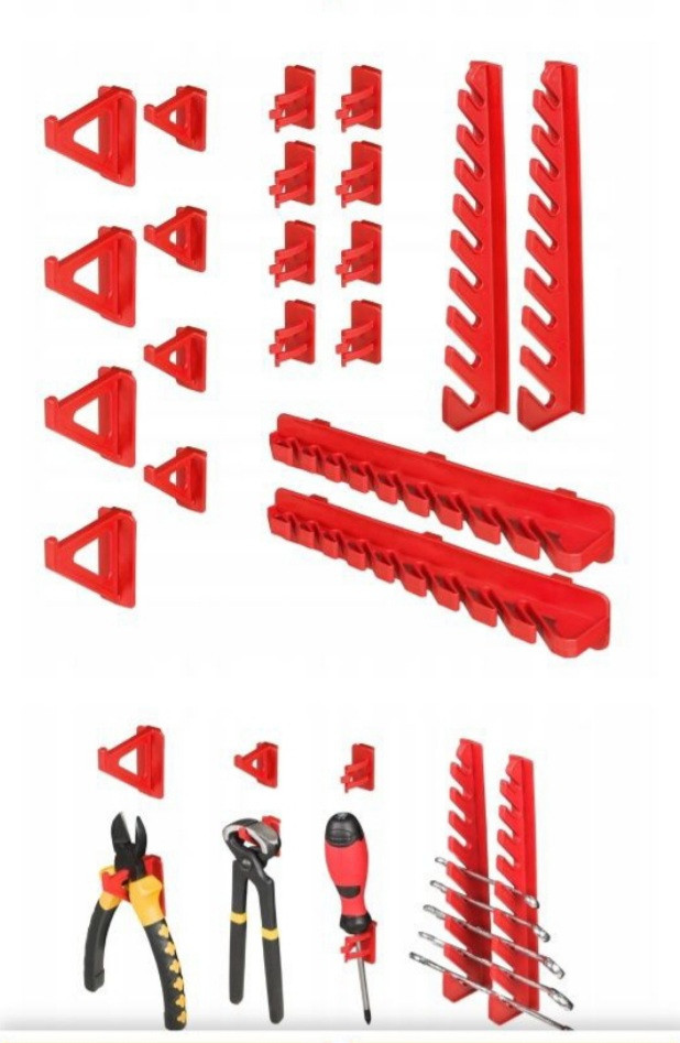 - 4 комплекти різних тримачів KBH 20 (8 вертикальних і 8 горизонтальних планок для ріжкових ключів, 32 тримача для викруток, 16 гачків 5,5 см, 16 гачків 3,5 см).
