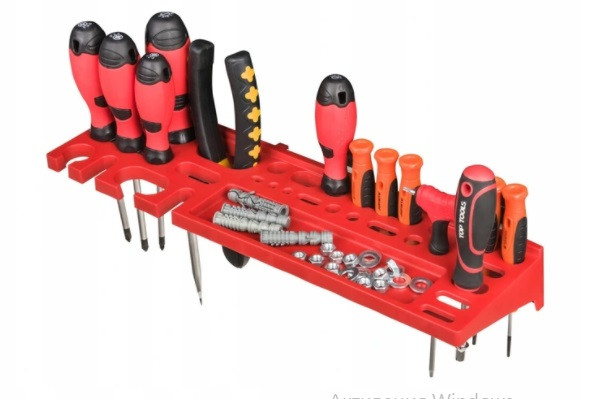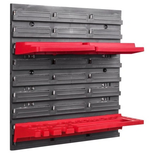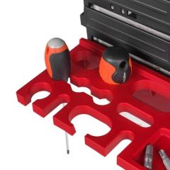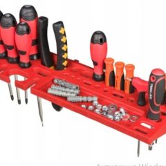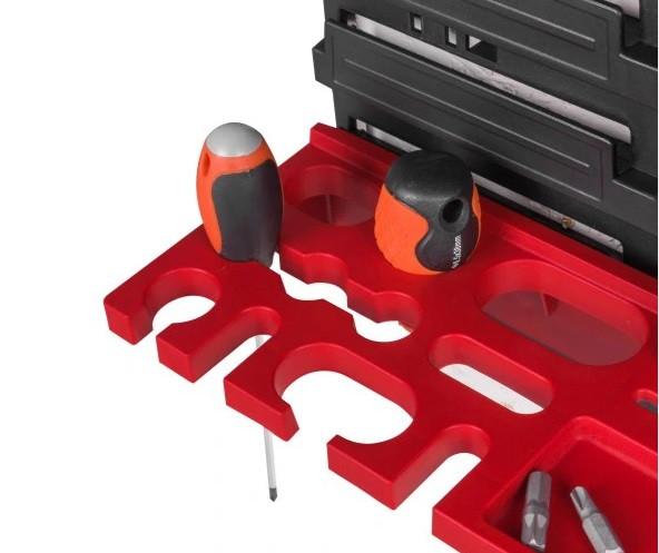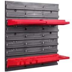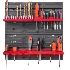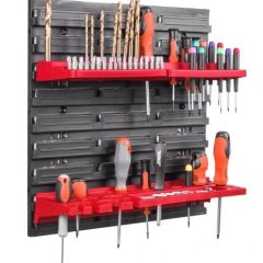 - 1 подвійна полка KBS 20-3020 (сі 87 отворів). Одна частина 190 х 110 х 30 мм) - для біт, свердл, дрібних інструментів; друга частина (180 x 110 x 30 мм) - для отворів, пильників, стамешок, молотків та інших інструментів.