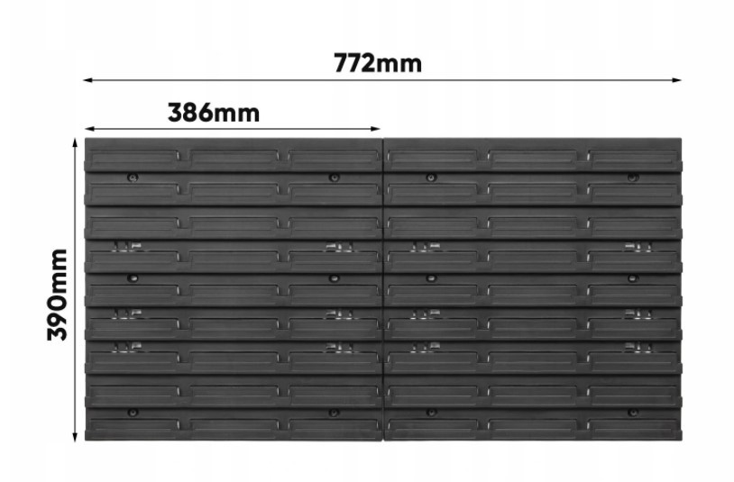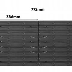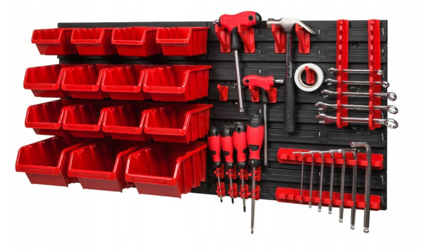 Контейнери можна встановити на дошці у будь- якому порядку. Дошки сполучаються між собою горизонтально спеціальними замками на краях. Дошка ідеально підходить для гаража або майстерні.